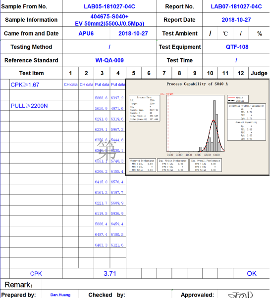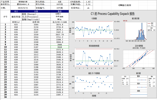 其次,評判超聲波產(chǎn)品的穩(wěn)定性。這個(gè)可以要求超聲波企業(yè)提供已有案例的穩(wěn)定性文件,例如cmk﹑cpk﹑ppk文件。下圖是我司客戶50平方銅線+端子的文件: